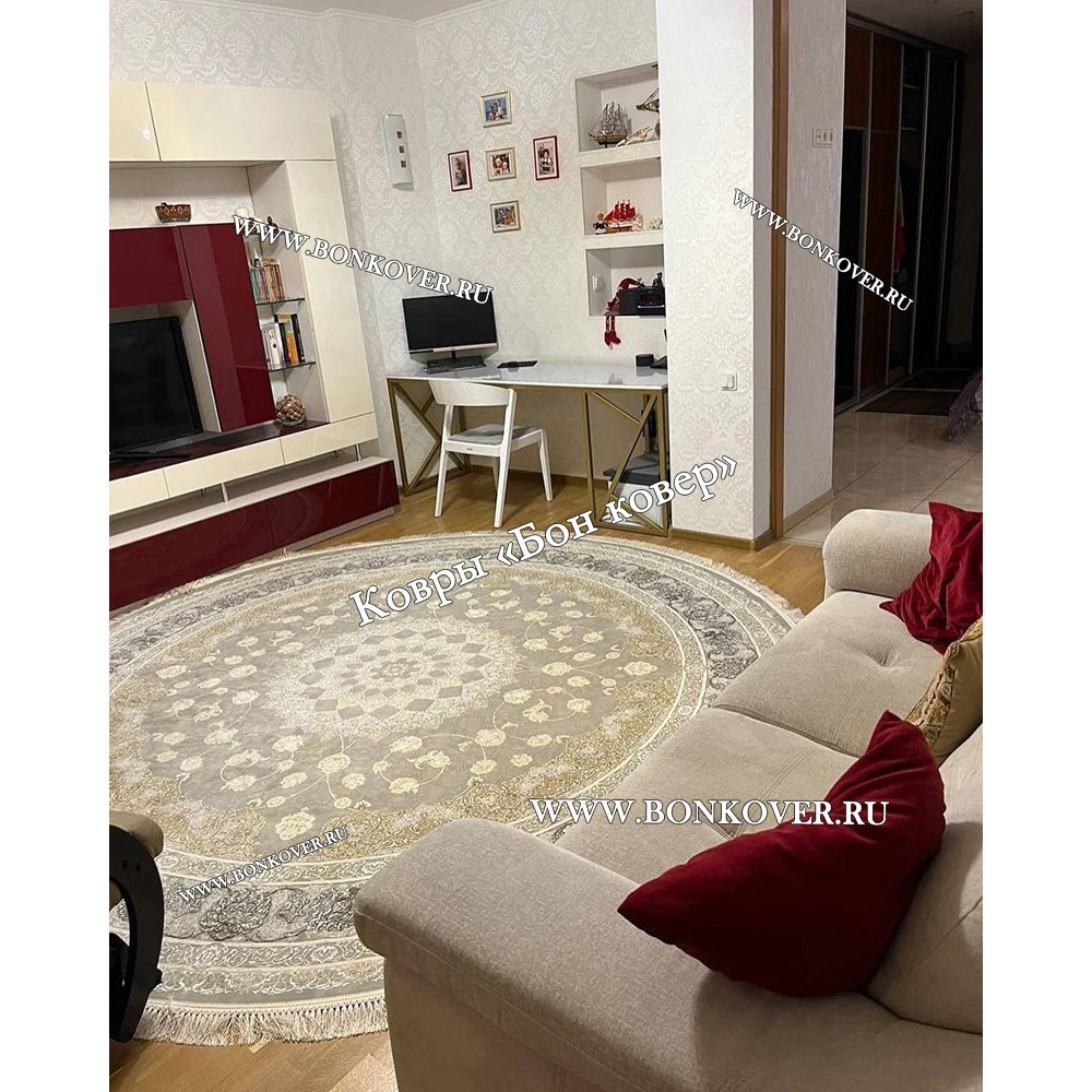 Иранский Круглый Ковер Для Гостиной Арт 30239 станет идеальным дополнением интерьера, оформленного в современном или классическом стиле. Мягкое, но прочное, ковровое изделие обеспечивает тепло- и шумоизоляцию, отличается длительным сроком эксплуатации, пожаробезопасностью, экологичностью и высокой износостойкостью, является отличной гарантией от повышенной влажности в помещении и утеплителем для холодного пола. Благодаря качеству материалов, ковер не деформируется, сохраняет форму под тяжестью предметов мебели. За его поверхностью легко ухаживать.